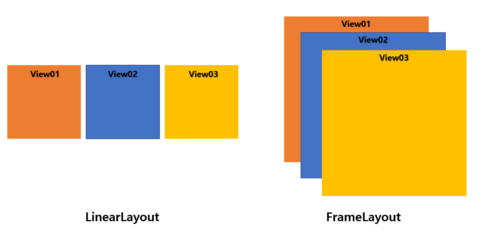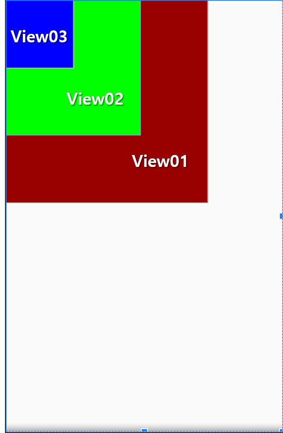 이런 식으로 FrameLayout 내에서 첫번째로 선언한 View01 은 가장 하단에 배치되고, 마지막으로 선언한 View03은 가장 상단에 배치됩니다.