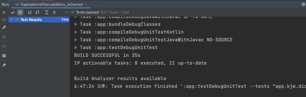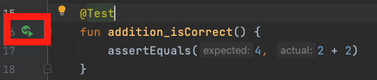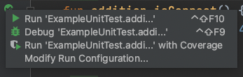 메소드 이름 옆의 화살표를 누르면 아래와 같이 뜨는데, Run 'ExampleUnitTest.addition_isCorrect'를 선택한다.