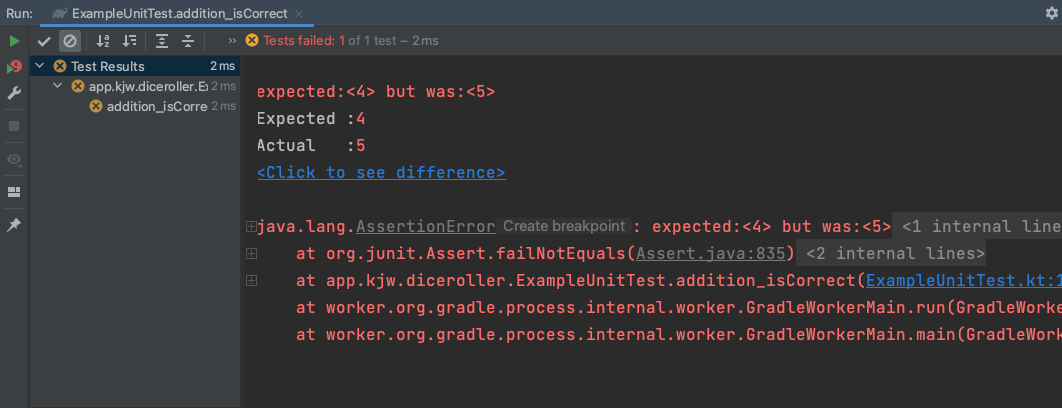 2. test 디렉토리에서 ExampleUnitTest.kt 파일을 열어보자