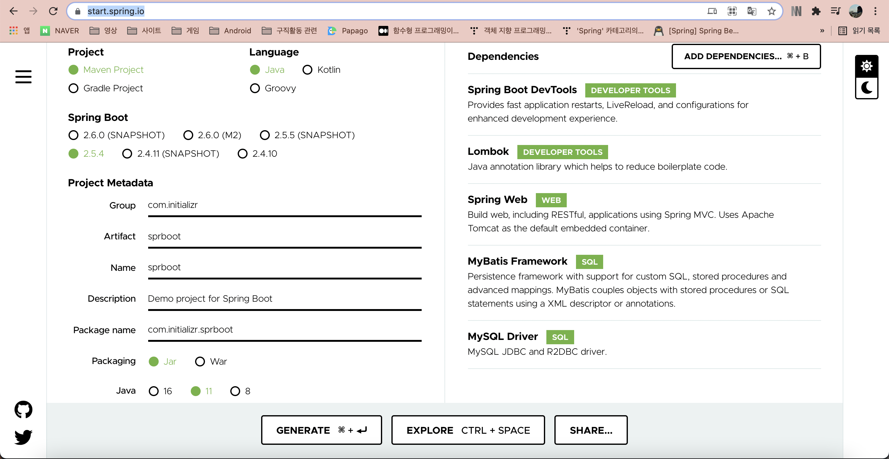 (방법 1) Spring Initializr 웹을 통해 프로젝트 다운
