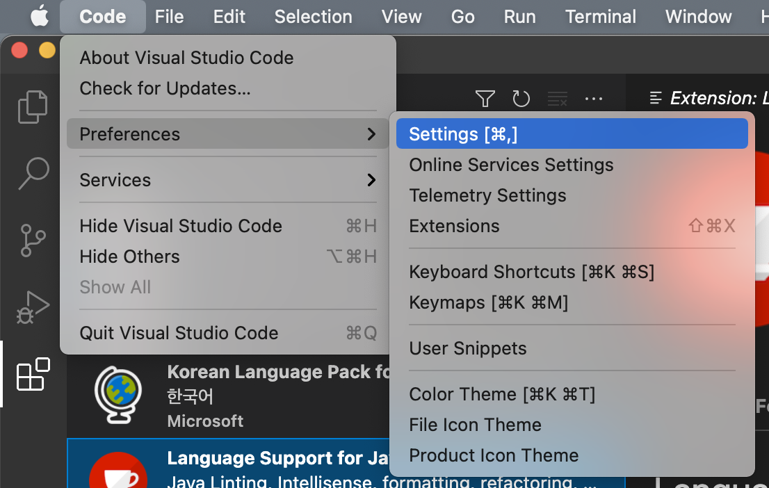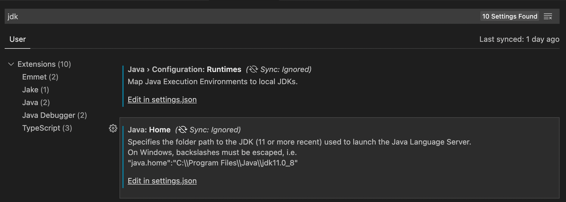 설정 - JDK 검색 - Java:Home 항목 의 Edit in Settings.json 클릭
