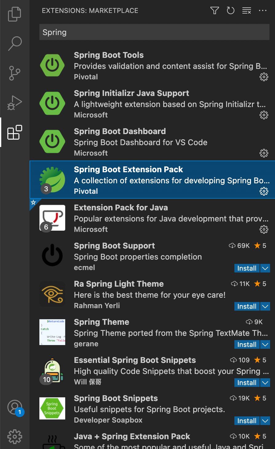 - Spring Boot Extension Pack (아래 세 개를 한번에 다운 받아주는 확장팩)